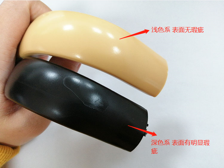 這是客戶的一個小電器外觀產品,材料為PP料,產品內部實心,膠位厚。通過圖片可以看到,客戶寄來的這兩個樣板(同一個機臺生產),淺色的把手表面無明顯瑕疵,不會影響美觀;深色的把手表面有明顯的流痕瑕疵,嚴重影響了美感,看起來像是瑕疵品。