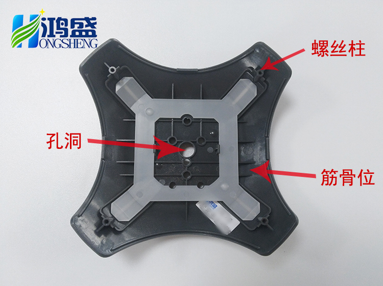 從產品背面可以看到,該產品的結構還是比較復雜的,螺絲柱+孔洞+筋位同時并存,這樣的產品結構通常來說對免噴涂工藝是很不友好的,容易因此產生流痕熔接線而大大影響美觀。而鴻盛的鐵灰色免噴涂應用在這樣的產品上能達到這樣的效果質感,也反映了我們鴻盛在專注免噴涂這條道路上還是取得了一定成績的。
