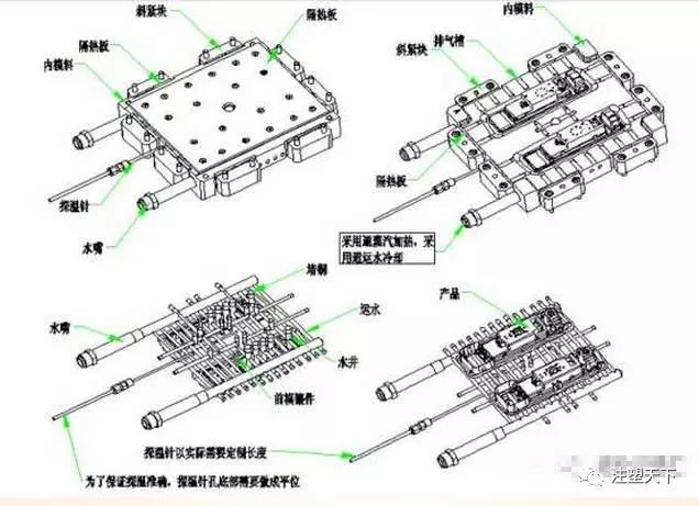 2.產品面設計水道一側離產品面一般選用5-6mm;選大了對模具升溫時間有影響,選小了對模具的強度有影響。水道平行產品面須要平均勻排布(原質中間15mm等距離分布)熱電偶應設計在兩水道中間,深度在50mm以上,不超過去100mm,視模具定結構而靈活掌握。每套模具PT100是一配一的,保持它的準確度,需要把它插到模具型腔模仁內,并加以固定。用引線連到模具外側,再連接到溫控機插座上。