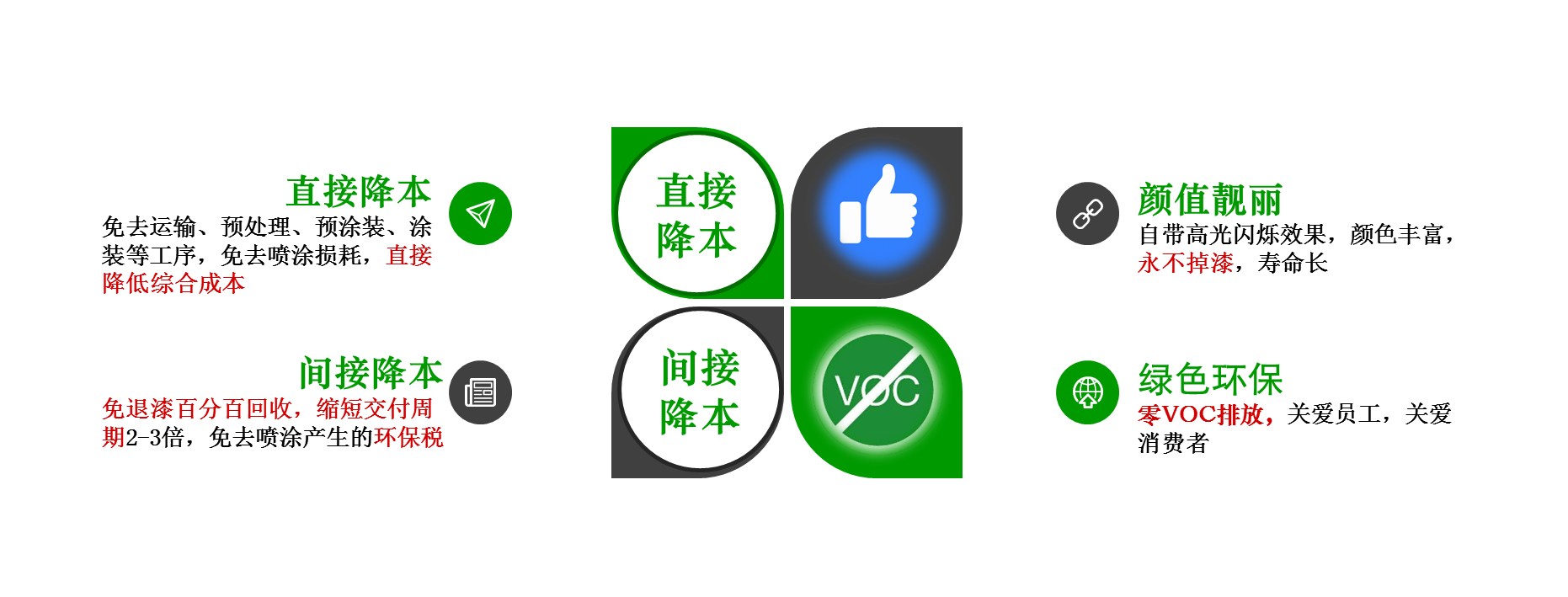 免噴涂材料是一種無(wú)需噴涂,可以直接注塑或擠出加工成不同的塑料制件,且自帶絢麗多彩外觀效果的材料。免噴涂制品擁有以下幾個(gè)共同優(yōu)點(diǎn):