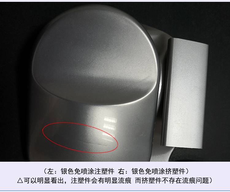 因此我們開發了專門用于多層共擠表面料的金銀質感免噴涂,直接通過多層共擠實現金銀質感效果,且無流痕無熔接痕,無需再進行后期噴涂,大大節省了客戶的生產成本和生產周期!