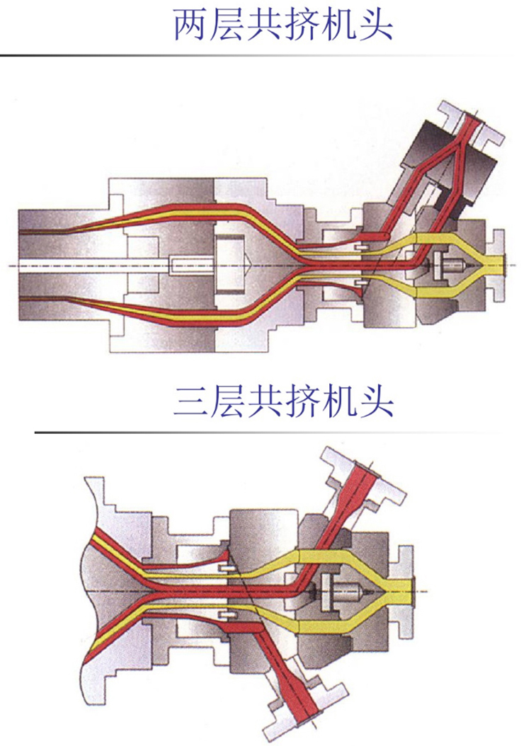 多層共擠是采用多臺擠出機擠出同種或異種樹脂同時進入一個復合模頭中,各層樹脂在模頭內或外匯和形成一體,擠出復合后經冷卻定型形成多層共擠出的制品。
