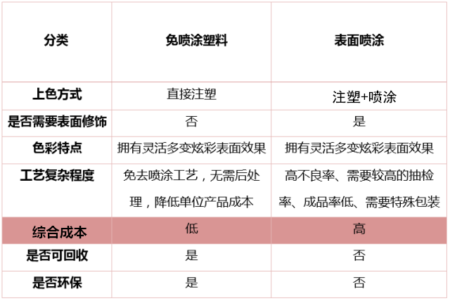 從環保、低碳、成本、工藝等各方面綜合對比分析,免噴涂材料的優勢相對來說非常明顯。免噴涂塑料一次注塑成型,良品率高,無需后期噴涂即可呈現特殊的珠光、金屬光澤及絢麗色彩等理想外觀,其良好的可回收性進一步有助于環保戰略的有效實施。