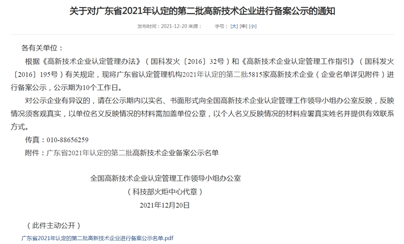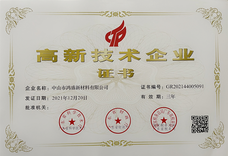 2021年12月20日,全國高新技術企業認定管理工作領導小組辦公室發布《關于對廣東省2021年認定的第二批高新技術企業進行備案公示的通知》,中山市鴻盛新材料有限公司名列其中,成為國家重點支持的具有高成長性的企業。
