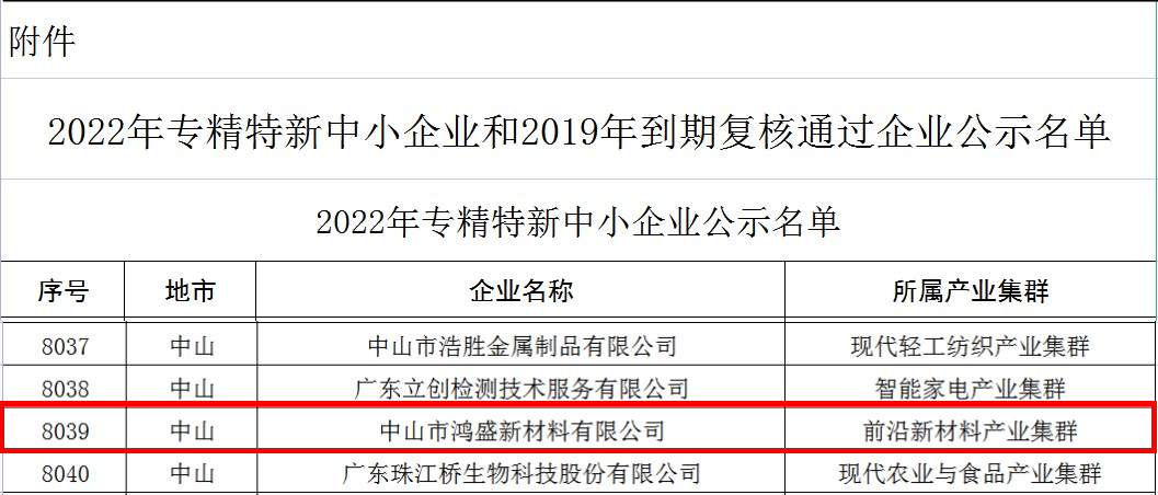 經過地市推薦、專家評審、征求意見等程序,鴻盛新材料從眾多的家廣東省創新型中小企業中脫穎而出,榮獲2022年廣東省“專精特新”中小企業稱號。這是對公司多年以來的產業價值、行業貢獻的肯定,也是對公司主營業務專業化的認可。